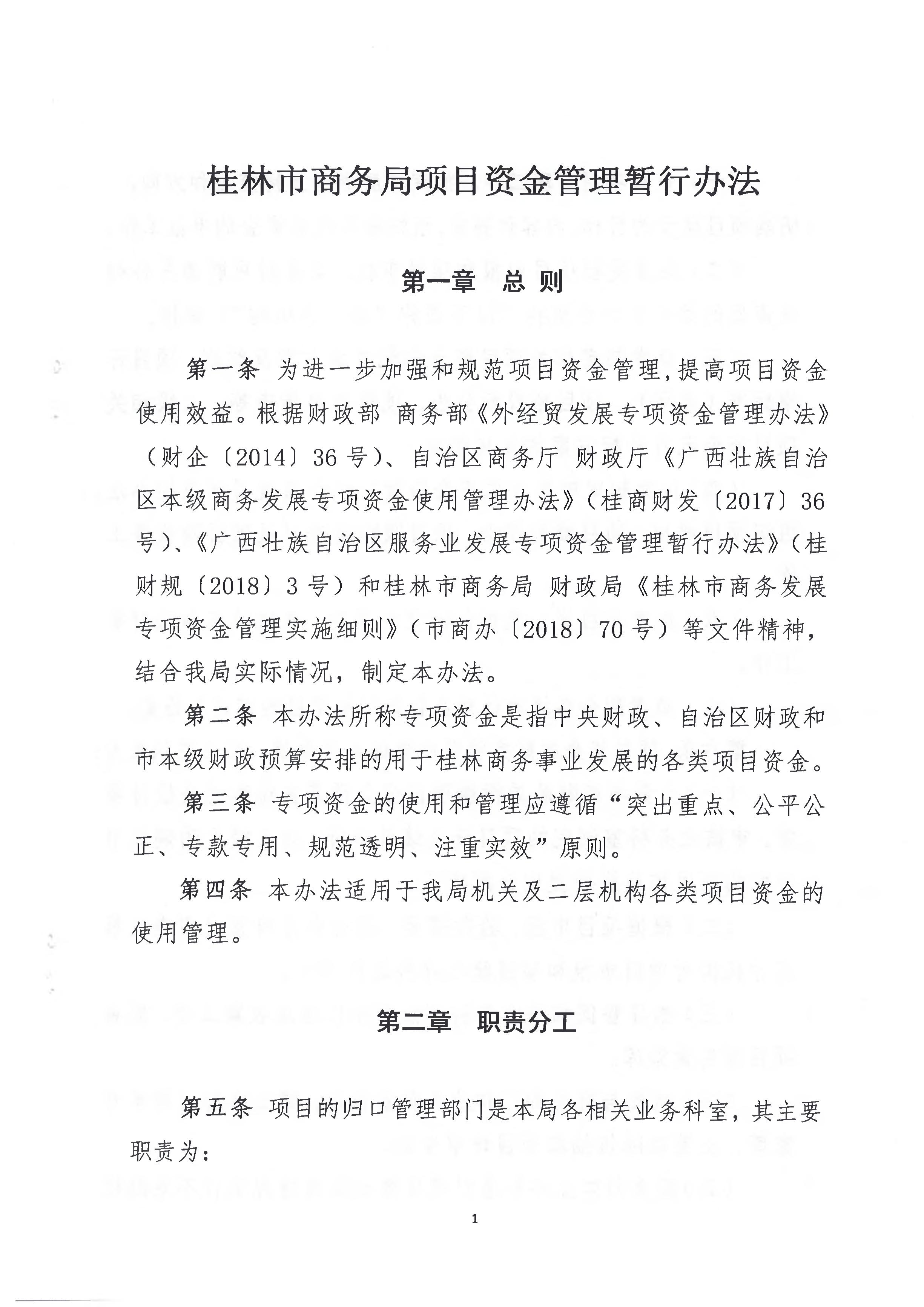 为进一步加强和规范我局项目资金管理,提高项目资金使用效益。根据财政部商务部《外经贸发展专项资金管理办法》(财企〔2014〕36号)、自治区商务厅财政厅《广西壮族自治区本级商务发展专项资金使用管理办法》(桂商财发〔2017〕36号)、和桂林市商务局 财政局《桂林市商务发展专项资金管理实施细则》(市商办〔2018〕70号)等文件精神,结合我局实际,对2018年印发的《桂林市商务局项目申报与管理暂行办法》进行了修改完善,形成了新的《桂林市商务局项目资金管理暂行办法》,现印发你们,请遵照执行。